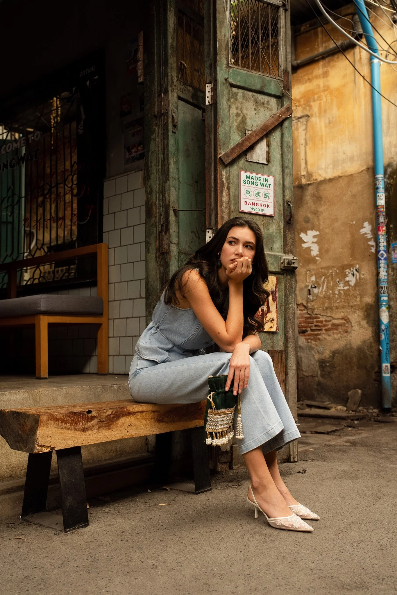 Le jean Mona est un jean coupe flare. Il épouse délicatement la ligne de la cuisse avant de s’évaser avec fluidité du genou jusqu’aux chevilles, dessinant une silhouette élancée et harmonieuse.